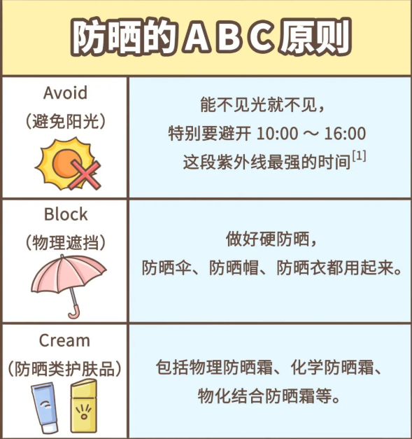 防晒剂有两类——物理类防晒剂,如:二氧化钛、氧化锌,可以直接将紫外线进行反射、散射;化学类防晒剂,如:二苯酮、水杨酸乙基己酯,能够和紫外线发生反应,从而吸收紫外线,保护皮肤不与紫外线直接接触。防晒化妆品的标签上通常会标示SPF值和PA等级,SPF值越大、PA“+”越多的产品防晒效果越好。
